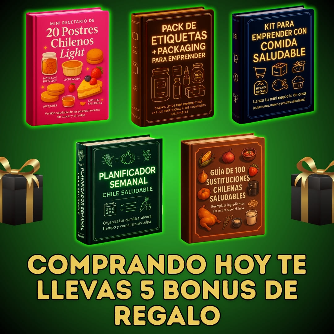 • Acceso a 5 bonus exclusivos que incluyen planificador semanal, guía de sustituciones, recetario de postres light, kit para emprender y pack de etiquetas para tus colaciones saludables.